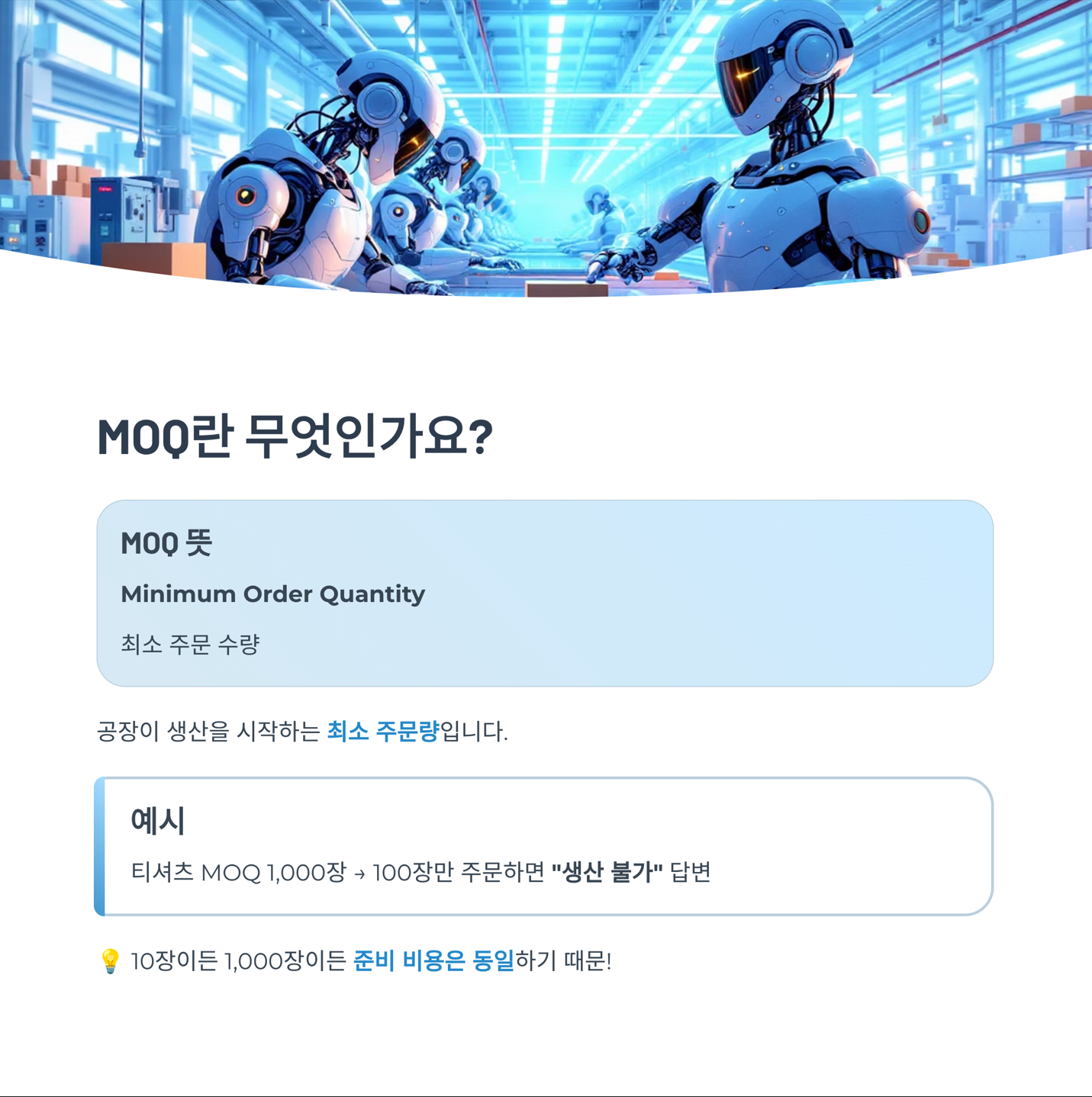 공장 입장에서는 10장을 만드나 1,000장을 만드나, 기계를 돌리기 위한 '최초 준비 비용(고정비)'이 똑같이 들기 때문입니다. 이 비용을 회수하고 최소한의 이익을 남기기 위해 '이만큼은 주문해야 우리도 손해 안 본다'는 기준선, 즉 MOQ를 설정하는 것입니다.