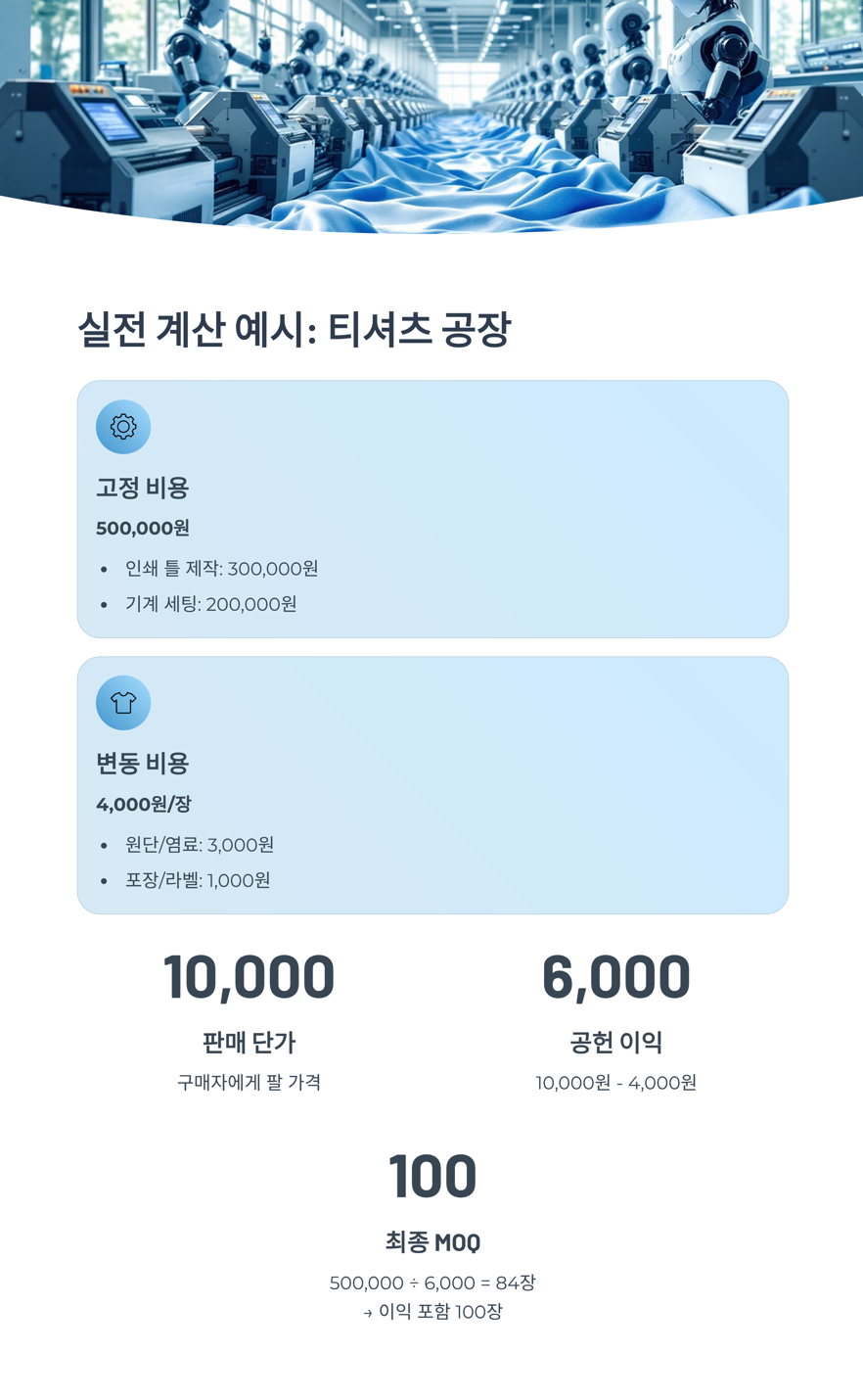그럼 공장 사장님들은 이 MOQ를 어떻게 정할까요? 복잡한 회계 공식을 쓰기도 하지만, 기본 개념은 '손익분기점(BEP)' 계산과 같습니다. 제가 티셔츠 공장 사장이라고 가정하고 쉽게 계산해 볼게요.