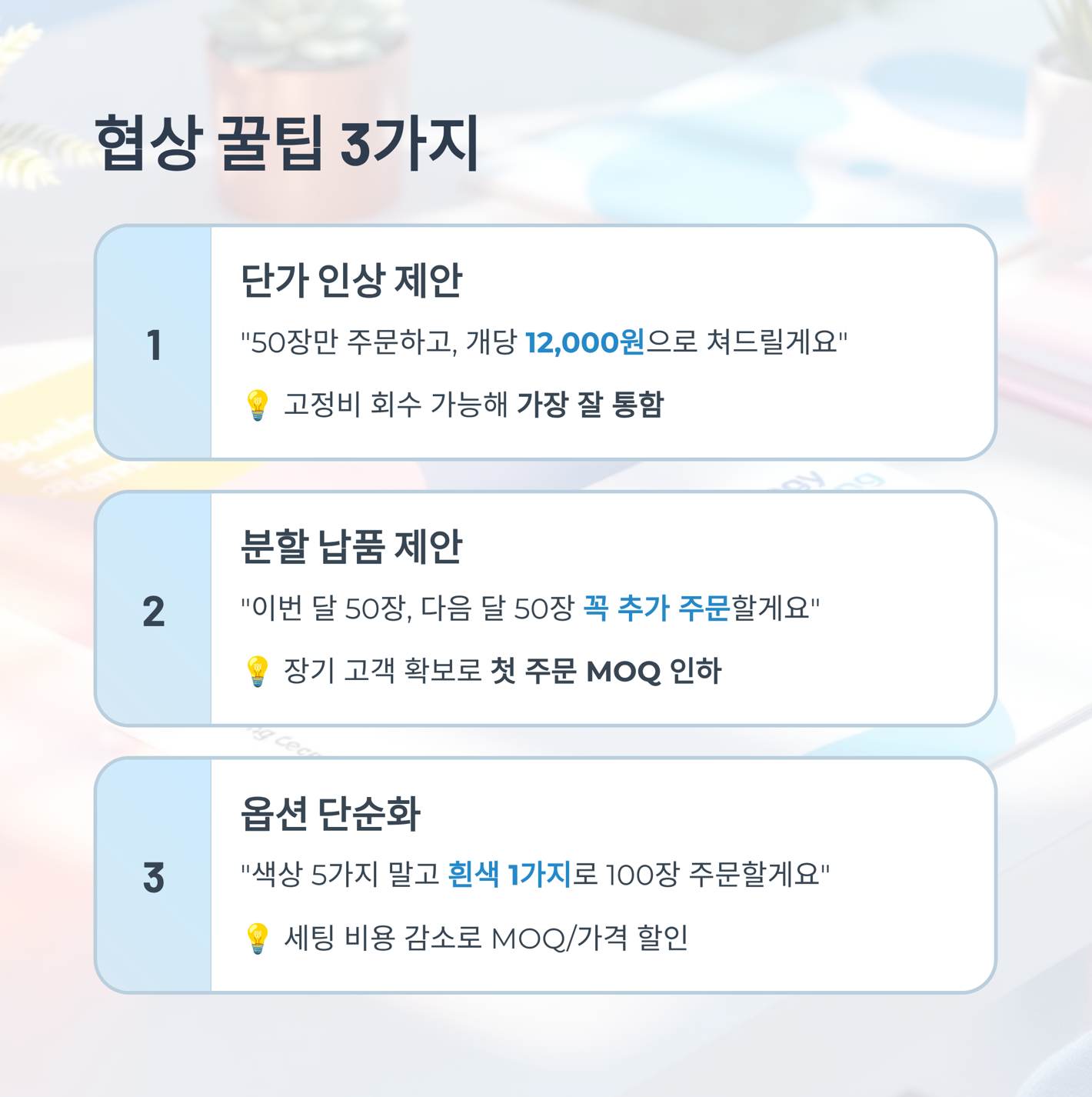 "사장님, MOQ 100장은 너무 많아요. 대신 50장만 주문하고, 개당 단가를 10,000원이 아니라 12,000원으로 더 쳐드릴게요." (공급사 입장에서는 고정비를 회수할 수 있어 가장 잘 통하는 방법입니다.)